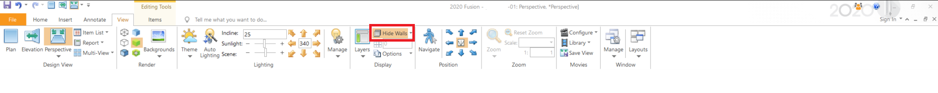 Tip: If the item does not appear in perspective view, it may be too high above the ceiling. Simply highlight the item in Plan view, and lower it by clicking the Pull Item(s) Towards icon under the Items tab.