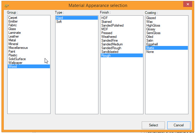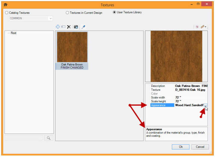 Upon editing a user defined texture, the user can update the group, type, finish or coating. This provides the possibility of better rendering quality by giving the user more texture appearance options.