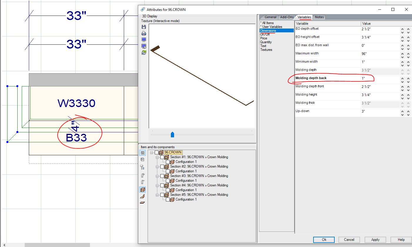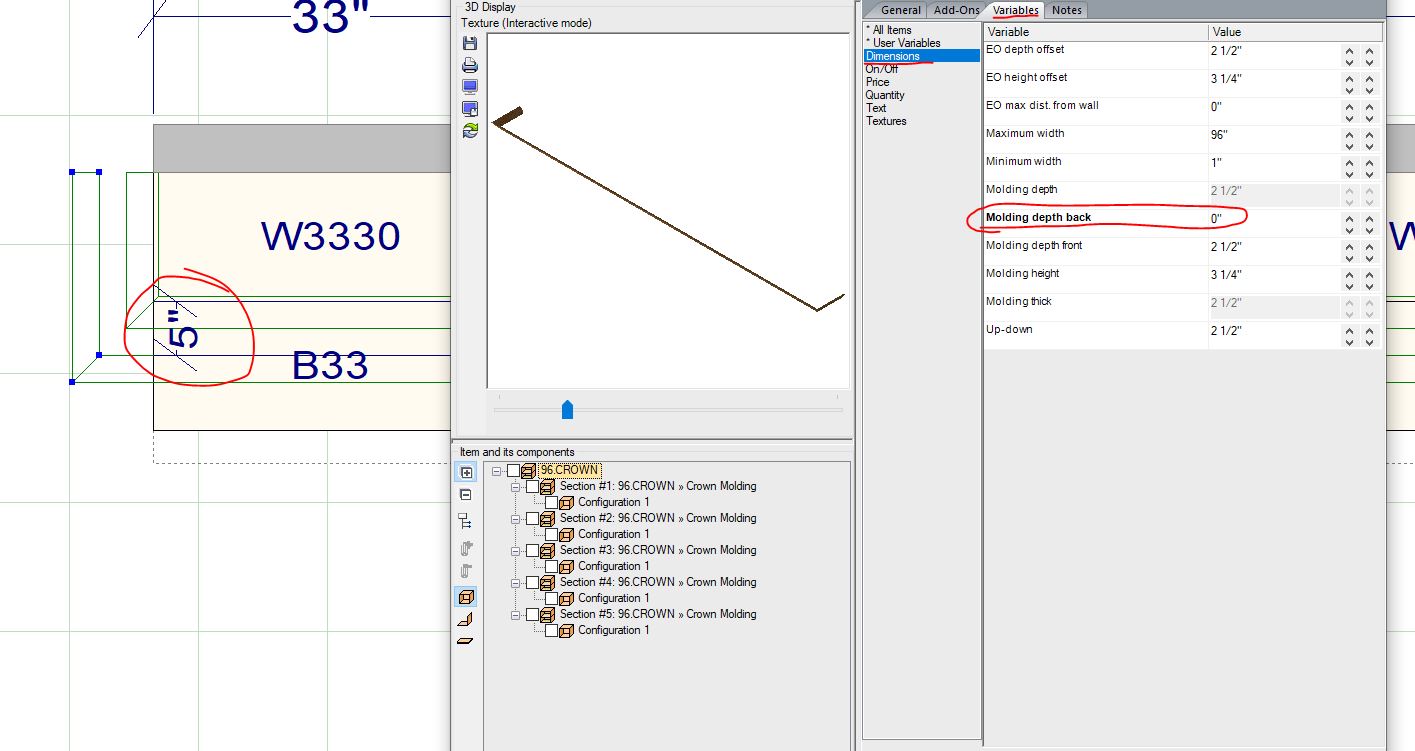 For Example, I have placed a 96.crown on the 96t molding. As you can see from the image I have attached, we only have 4″ instead of 5″ as I had set. If I want to see the correct dimension, then I need to go into the variables of the second molding and set the ‘Molding Back Depth’ to 0″ to have the correct dimension appear.
