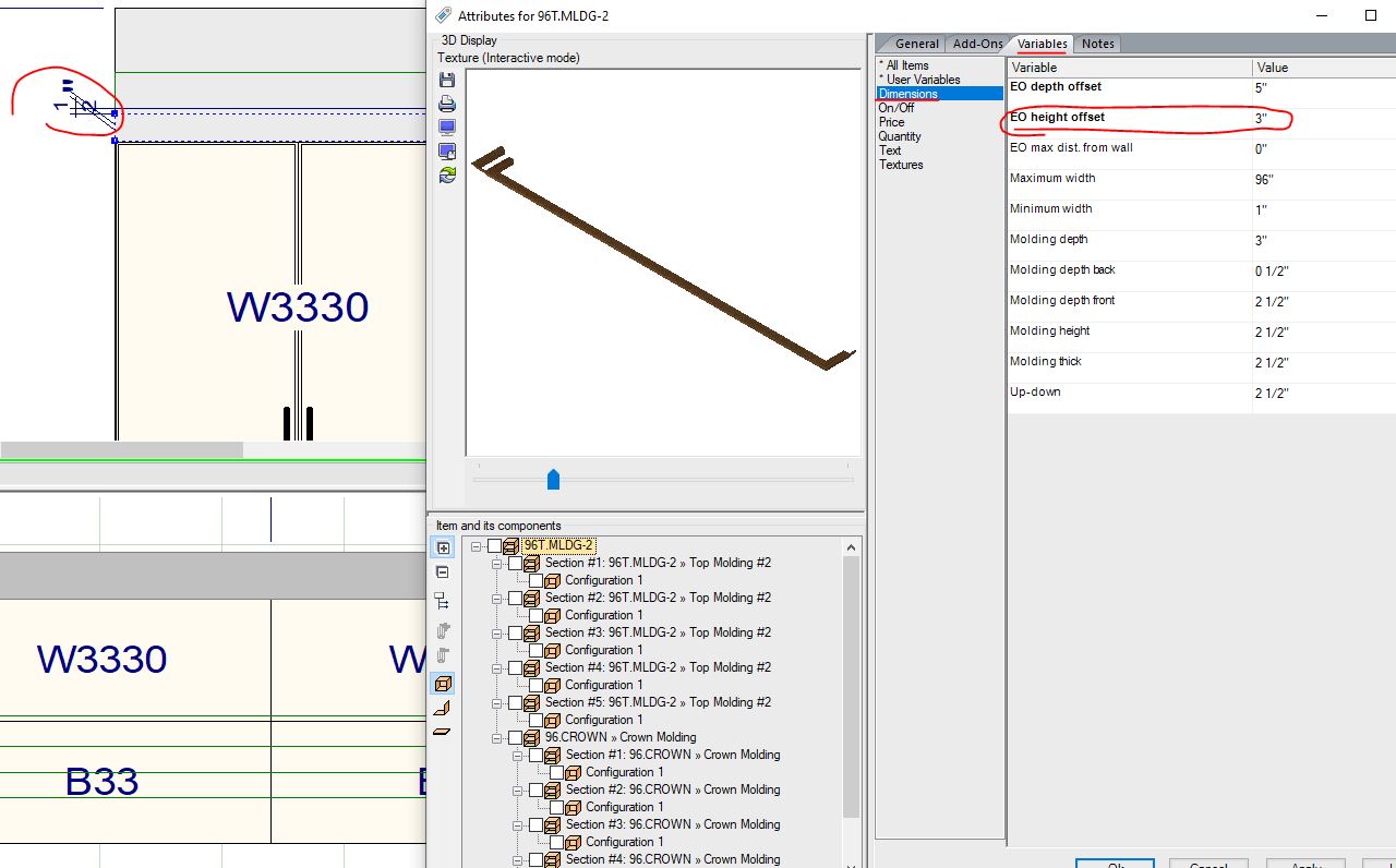 I’ve used the 96T.MLDG-2 molding from Sample_F. When going to the Attributes > Variables of the item, you will notice that the EO height offset is set at 2.5 inches. This means that the second molding will sit directly on top of the 96t.mldg-2. If you were to increase the eo height offset to 3 inches, then the second molding will be floating 0.5 inches above the first molding. See attached Image.