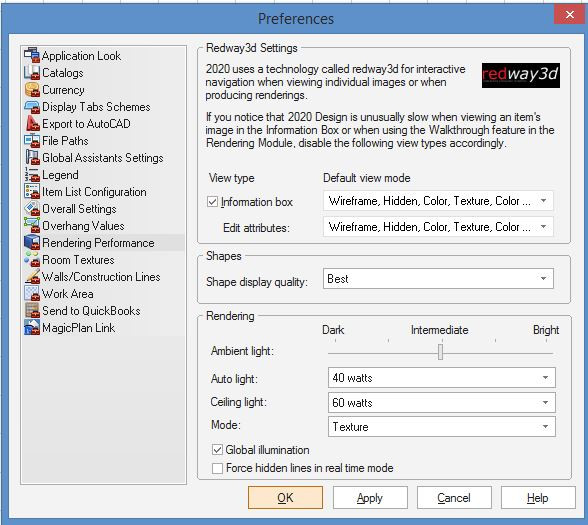Preferences, Rendering Performance, Shapes (in the midddle), Shape display quality