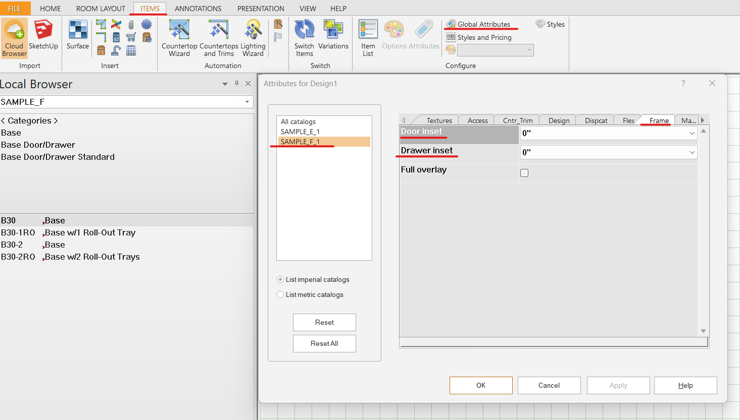 You can draw an inset door by using the SAMPLE_F catalog. Once you have your cabinetry on the floor plan, you can go to the Items tab and click on Global Attributes. In Global Attributes, select the SAPLE_F catalog on the left and then go to the Frame tab. In the Frame tab, you will have the ability to change the Door inset and Drawer inset.