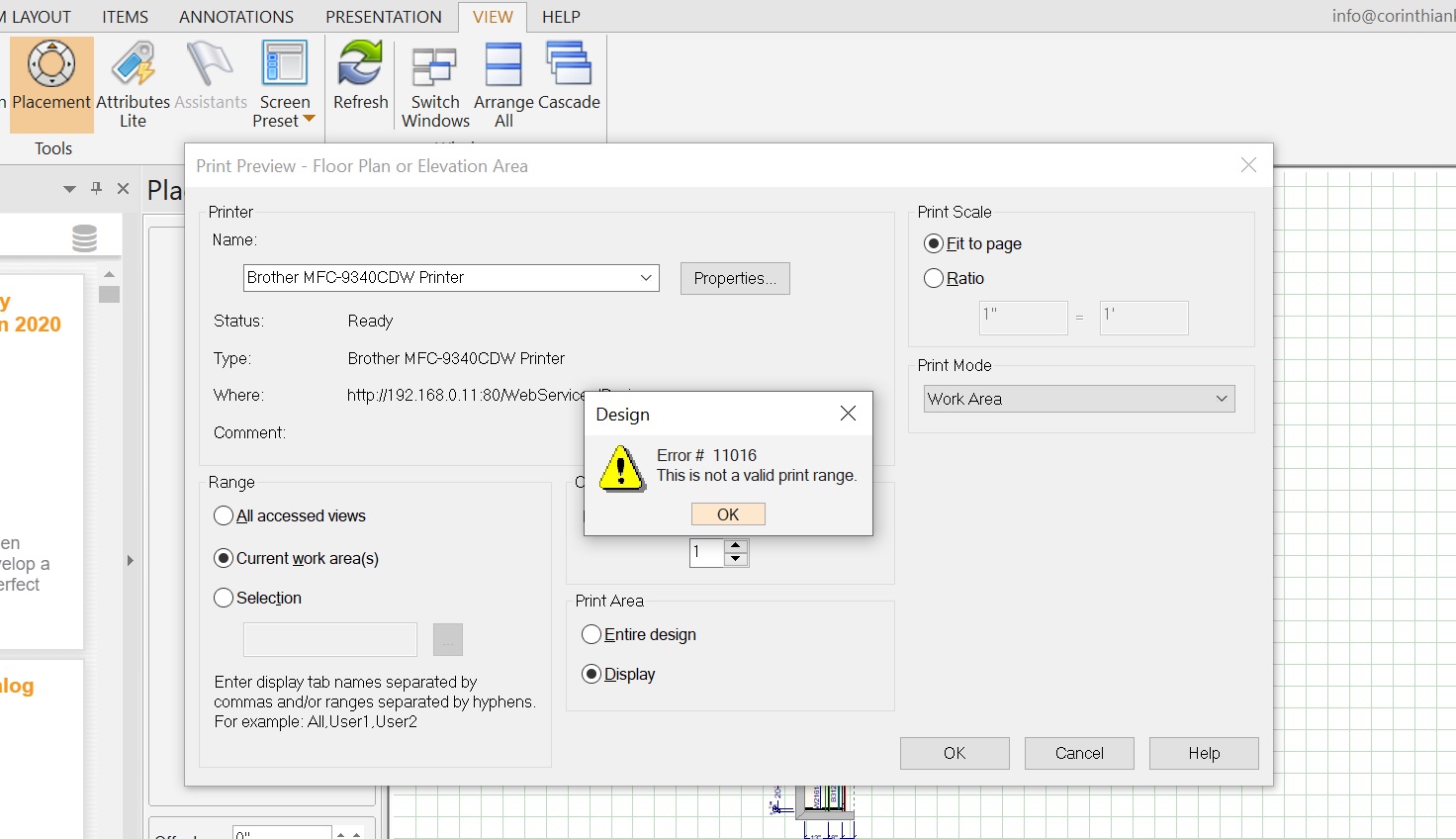 As a workaround, you can do what you had stated above. When you open your design, switch from the ‘All’ tab to the ‘All(No Dims)’ tab and then back to the ‘All’ tab. Once you do this, you should be able to print using the Current Work Area.