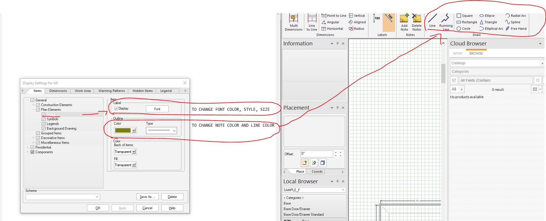 To change the default font and color for your notes, go to Display Settings by right clicking the floor plan. Then from the Items tab, expand ‘General’, expand ‘Plan Elements’ and select ‘Notes’. Once you select notes, click on Font on the right side of the window and that will open a smaller window which will allow you to change the font, font style, size, and color. To change the color of the ‘Line, Running Line, square, rectangle, circle. etc.. you will follow the same sets above, except when you go to ‘Notes’, you will change the color on the right under ‘Outline’. – See attached image.