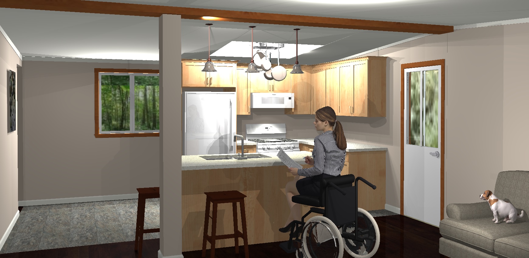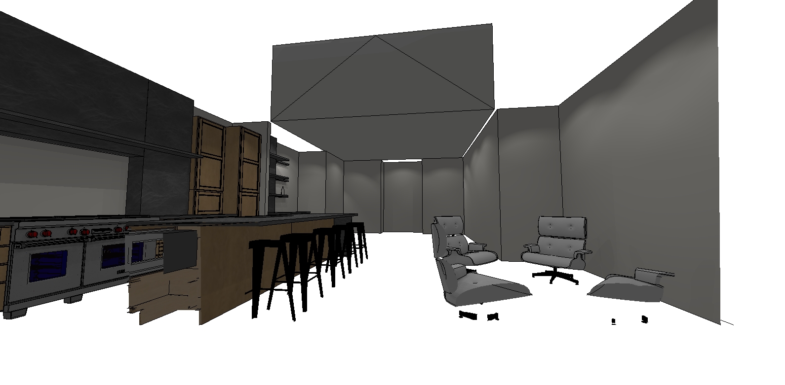 I recently had to do a small kitchen that had a slightly peaked roof with a skylight – and they wanted to hang a pot rack inside the skylight – so I HAD to render it.